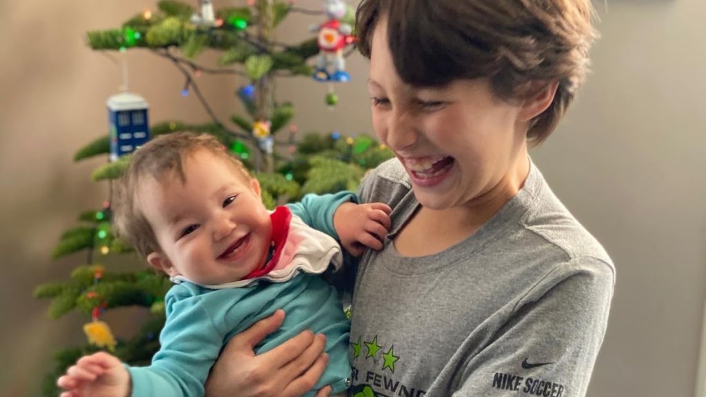 Our oldest and youngest posing for a minute in front of the Christmas tree. Love these guys.